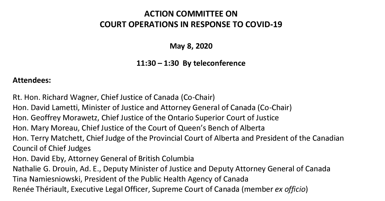 On May 8, 2020, the Department of Justice announced the creation of the Action Committee on Court Operations in Response to COVID-19 under the auspices of Richard Wagner, Chief Justice of Canada and Chairperson of the Canadian Judicial Council, and David Lametti, Minister of Justice and Attorney General of Canada.[1]