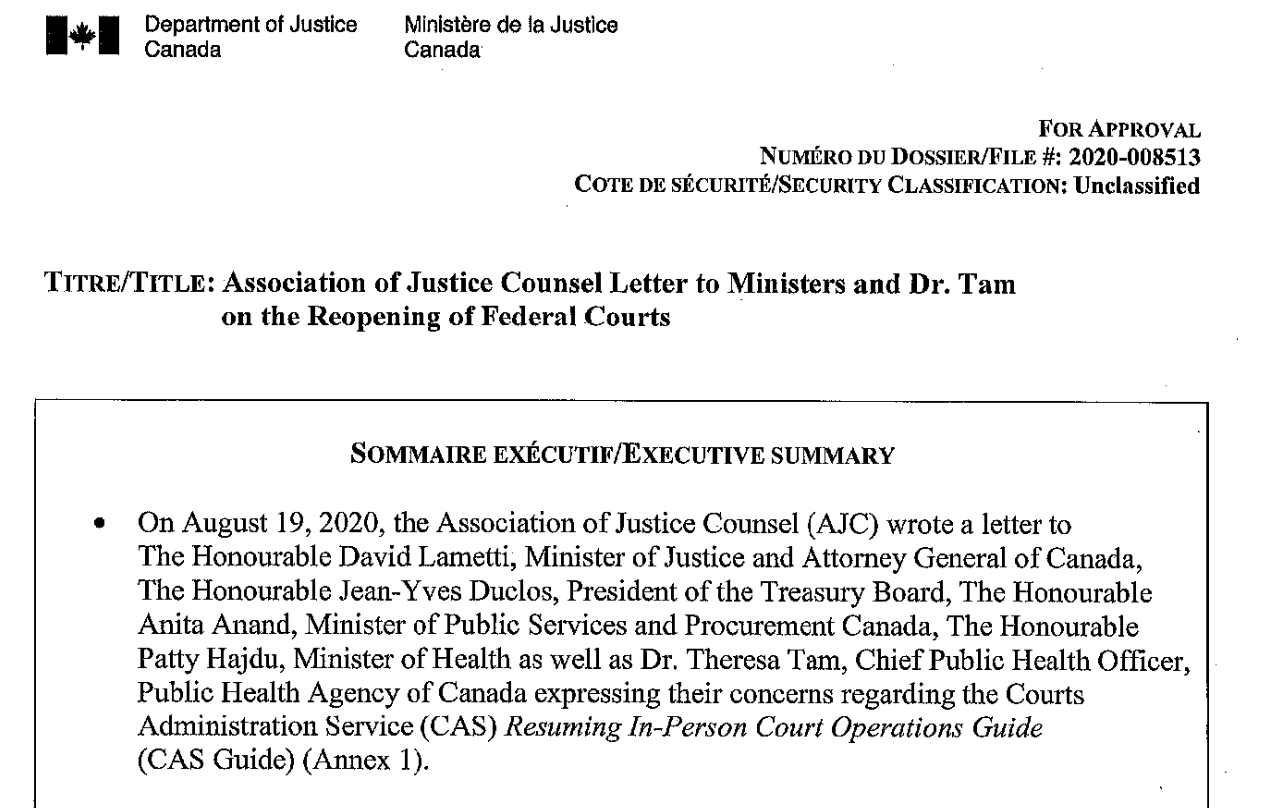 Action Committee on Court Operations in Response to COVID-19. (2020, July 30). Message from the Action Committee: Keeping Our Court Environments Safe in the Midst of a Pandemic. Office of the Commissioner for Federal Judicial Affairs Canada. https://web.archive.org/web/20211020010433/https://fja.gc.ca/COVID-19/Safe-court-environments-Pour-des-tribunaux-surs-eng.html ↩︎
