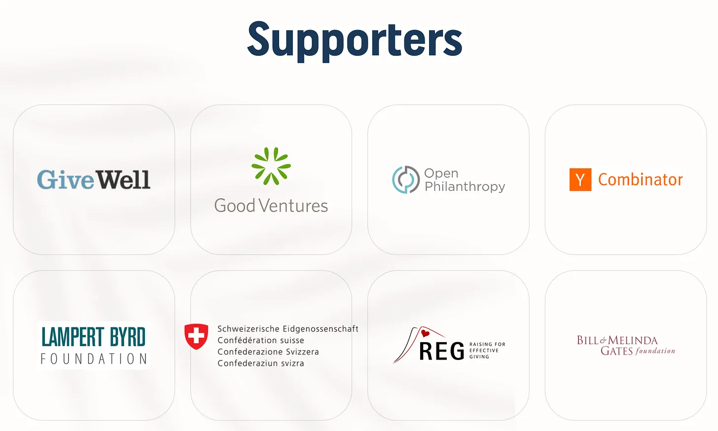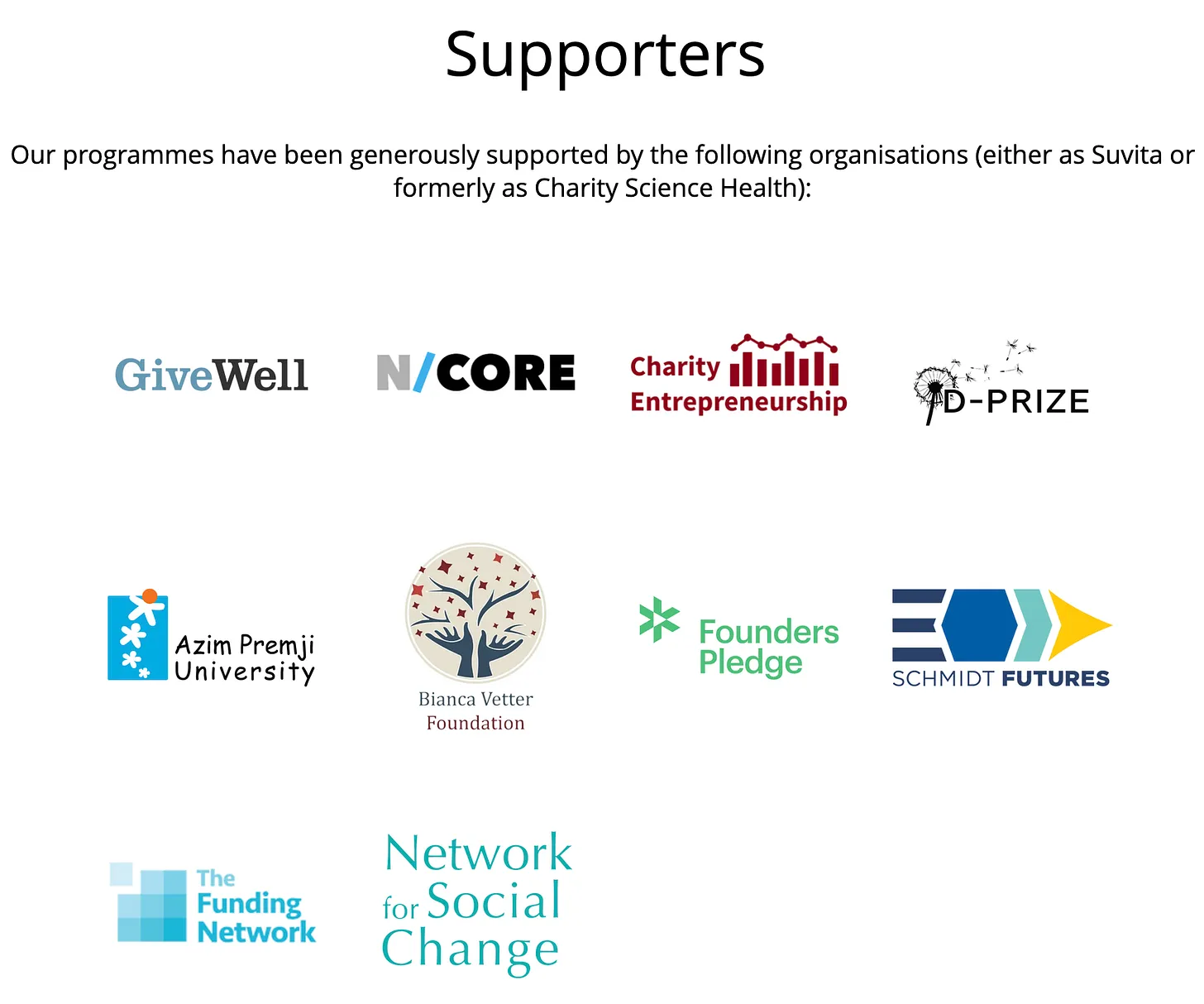 Another vaccine-related organization is Suvita, partnered with GiveWell, N/Core (an incubator of the Nudge Institute), Charity Entrepreneurship, D-Prize, Founders Pledge, Schmidt Futures (as in Eric Schmidt, of Google), The Funding Network, and Network for Social Change.9