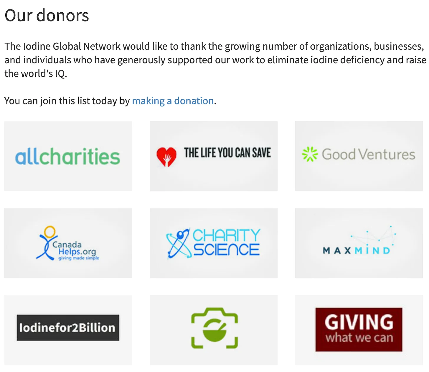 Then there’s the Iodine Global Network, whose partners and donors include UNICEF, the U.S. Centers for Disease Control and Prevention (CDC), United States Agency for International Development (USAID), the Good Ventures Foundation, and Giving What We Can itself.10, 11