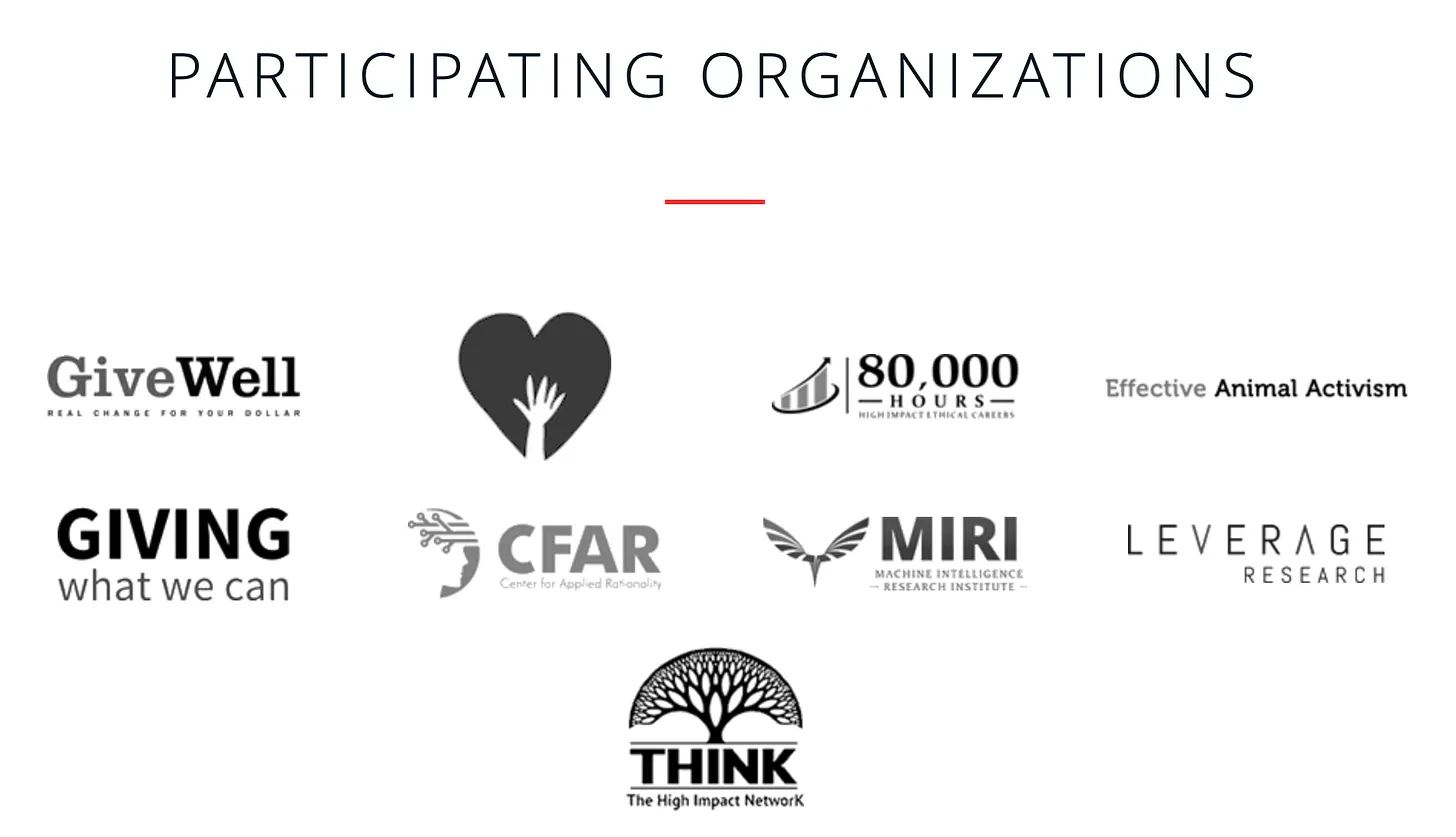 Jumping back slightly brings us to the inaugural Effective Altruism Global event, held in June/July 2013 in the San Franciso Bay Area.38 The 7-day event was hosted by the Centre for Effective Altruism, with participation from 80,000 Hours, Center for Applied Rationality, Effective Animal Activism (Animal Charity Evaluator), GiveWell, Giving What We Can, Leverage Research, Machine Intelligence Research Institute (MIRI), and The High Impact Network (THINK).39