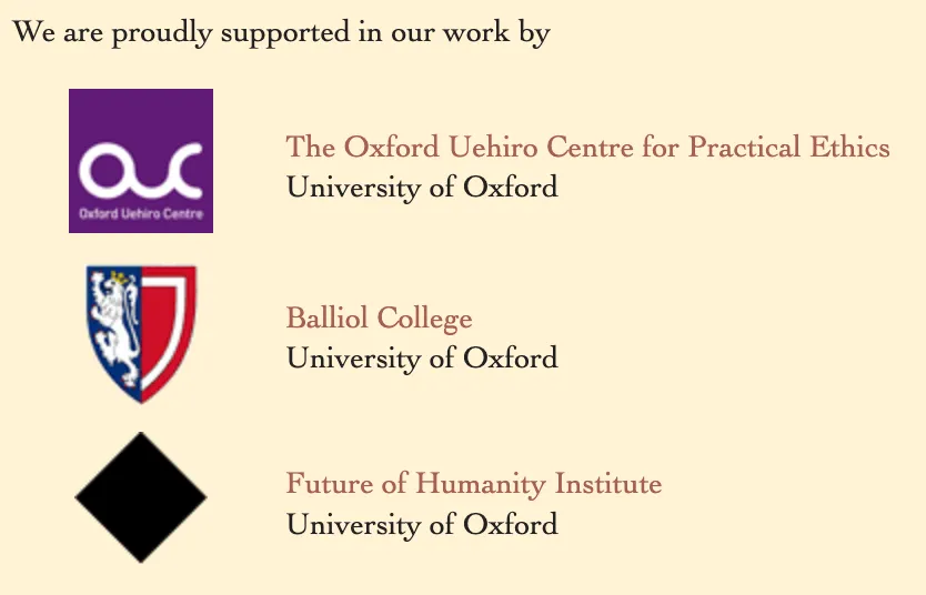 At launch, the organization described itself as “an international society dedicated to eliminating poverty in the developing world.” Funding was provided by the University of Oxford through the Oxford Uehiro Centre for Practical Ethics, Balliol College and the Future of Humanity Institute.2 Later funding came from the Pears Foundation and Dr. Frederick Mulder, “a Canadian art-dealer and philanthropist” who founded The Funding Network.3